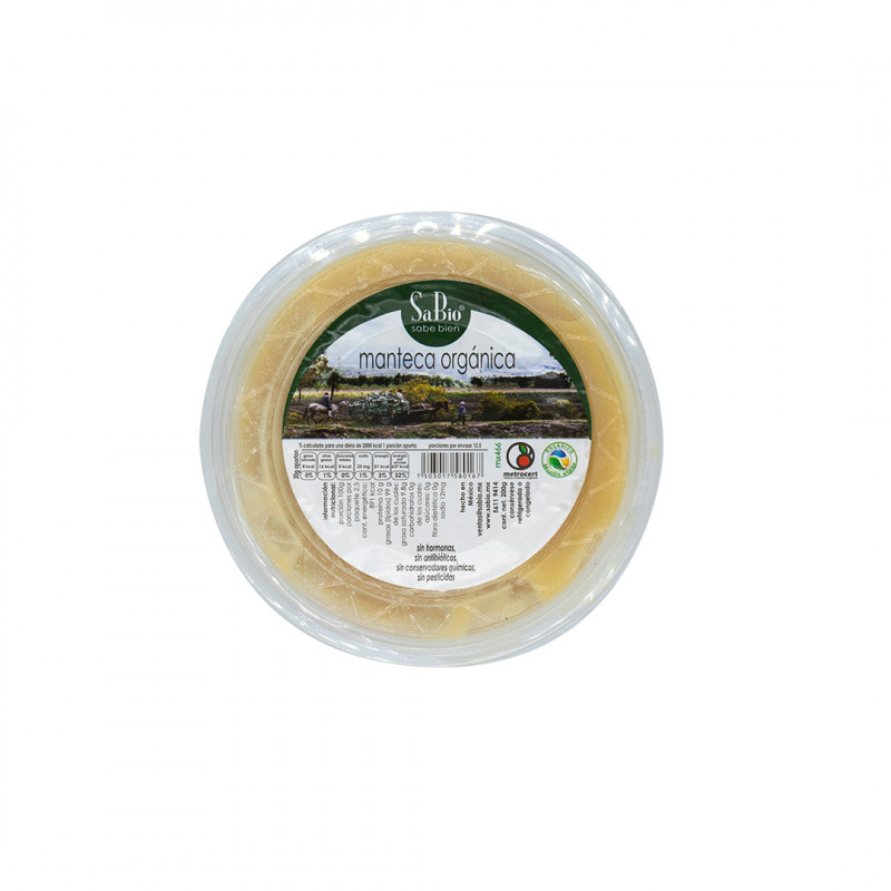 Paquete con 200 g. hecho con grasa interna de cerdo 100% orgánica sin residuos de sustancias de síntesis química. Vida de anaquel 90 días. Conservar en refrigeración 4 a 6 ºC