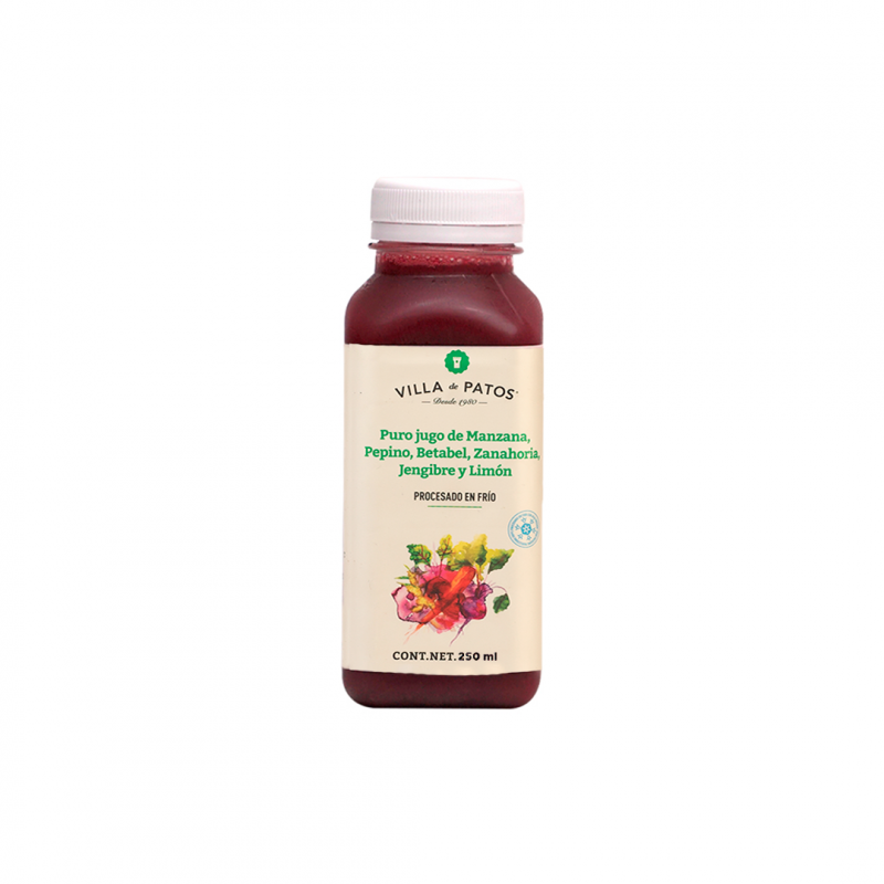 Ingredientes 100% naturales. Base de manzana con jengibre, betabel, zanahoria, pepino y limón. Procesado en frío con alta presión (HPP).